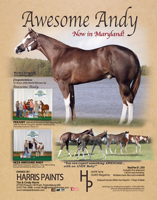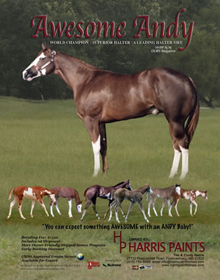 "Heza Awesome Cowboy" 2006 Sorrel Overo Gelding Awesome Andy X Sheza Lacey Cowgirl. 4th Overall APHA Worlds (tied for 3rd) Amateur Weanling Geldings? 4th Overall APHA Worlds Open Weanling Geldings shown by Sue Stafford? Indiana Futurity - Reserve Champion Non-Pro Weanling Colt/Gelding & 4th Overall Open Weanling Colts/Geldings? Ohio Futurity - 5th Open Sr. Weanling Colts & 4th Non-Pro Sr. Weanling Colts? Open Halter Point Earner