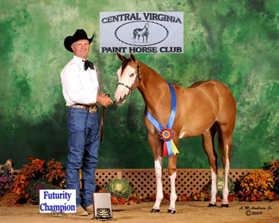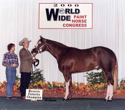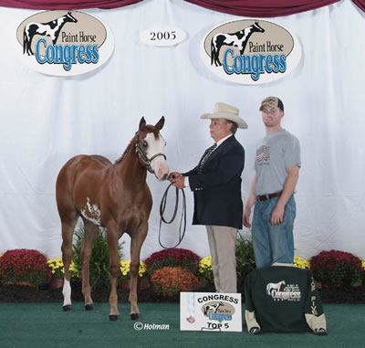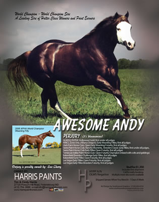 "Perjury" 2006 Sorrel Overo Filly Awesome Andy X Guilty As Sin. Owned by Sue Cherry of California? APHA WORLD CHAMPION Open Weanling Fillies shown by Fred Tabor? APHA RESERVE WORLD CHAMPION Amateur Weanling Fillies? Winner Hollywood Gold Futurity at GLAPHC/ACPHC (first under all 8 judges!)? Winner Weanling Filly Futurity Oregon Paint Horse Club (first under all 6 judges!)? Winner Utah Weanling Filly Futurity (first under all 5 judges)?