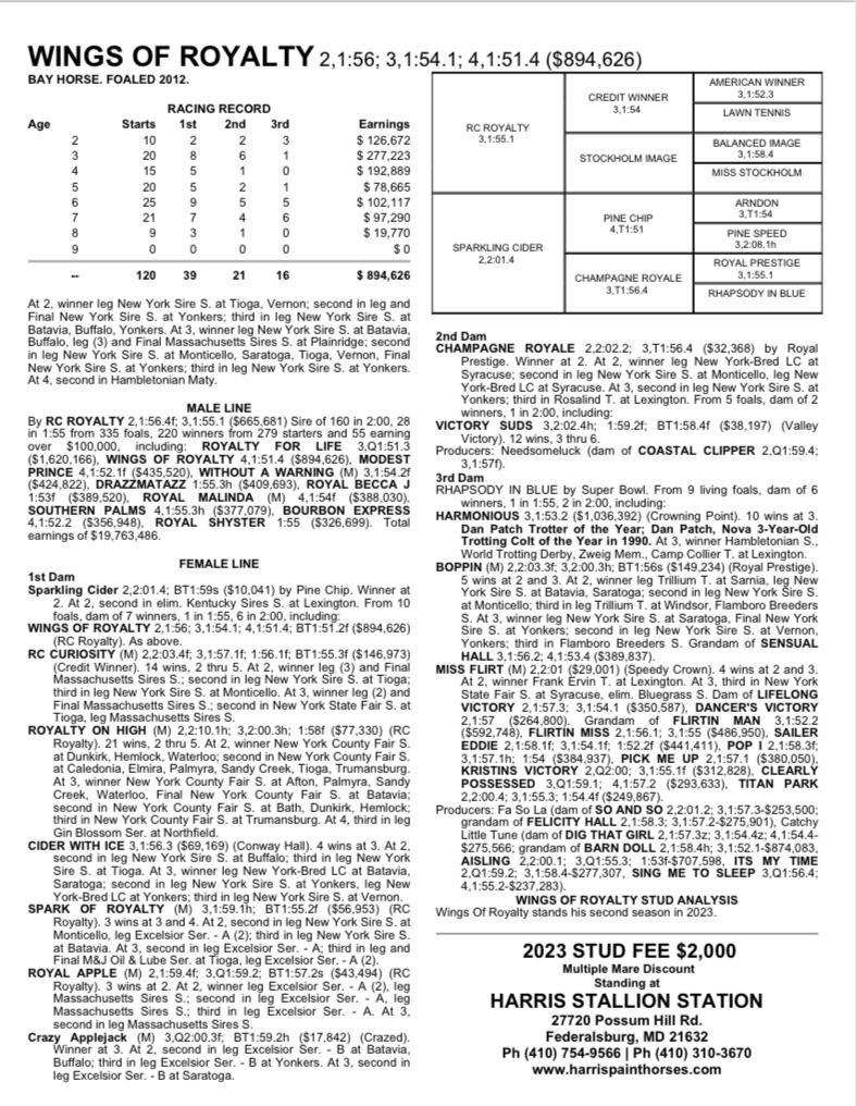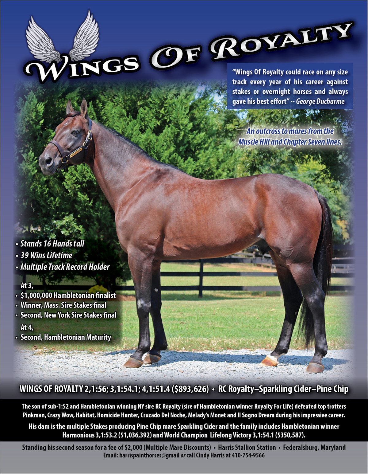 16 Hand Bay Stallion, 39 Lifetime wins and Multiple Track Record Holder. At 3 years old, Wings Of Royalty was a $1,000,000 Hambletonian Finalist, Winner of th Mass. Sire states Final, Second, New York Sire Stakes final. At 4 years old, Wings Of Royalty was second in the Hambletonian Maturity.